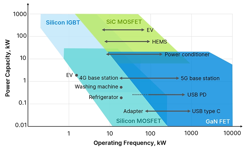 GaN is typically better suited for low-voltage (< 700 V) power supplies requiring high efficiency and high-power density, such as those used in consumer electronics (chargers/power adapters), 48 V data centers/computing, medical equipment, drones, communications equipment and a wide range of industrial equipment.