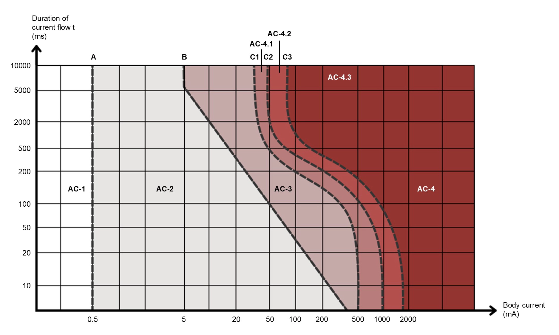 IEC 60479-1 details the effects of current on the human body which are characterized into 4 zones of current magnitude and duration of flow.