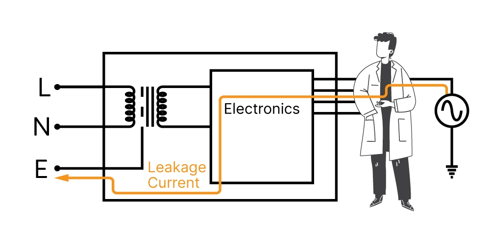 Leakage current is any current which has no functional purpose. It will flow from an intended circuit either to earth or a chassis for example. It can be generated due to a number of reasons such as parasitic capacitance in a transformer, non-perfect insulators and capacitive coupling from EMC filter circuits. It not intended to be applied to a patient body and is therefore restricted to non-hazardous levels by IEC 60601-1. Two types are relevant for medical power supplies: Earth Leakage Current and Touch Current (previously referred to as Enclosure Leakage Current in Edition 2).